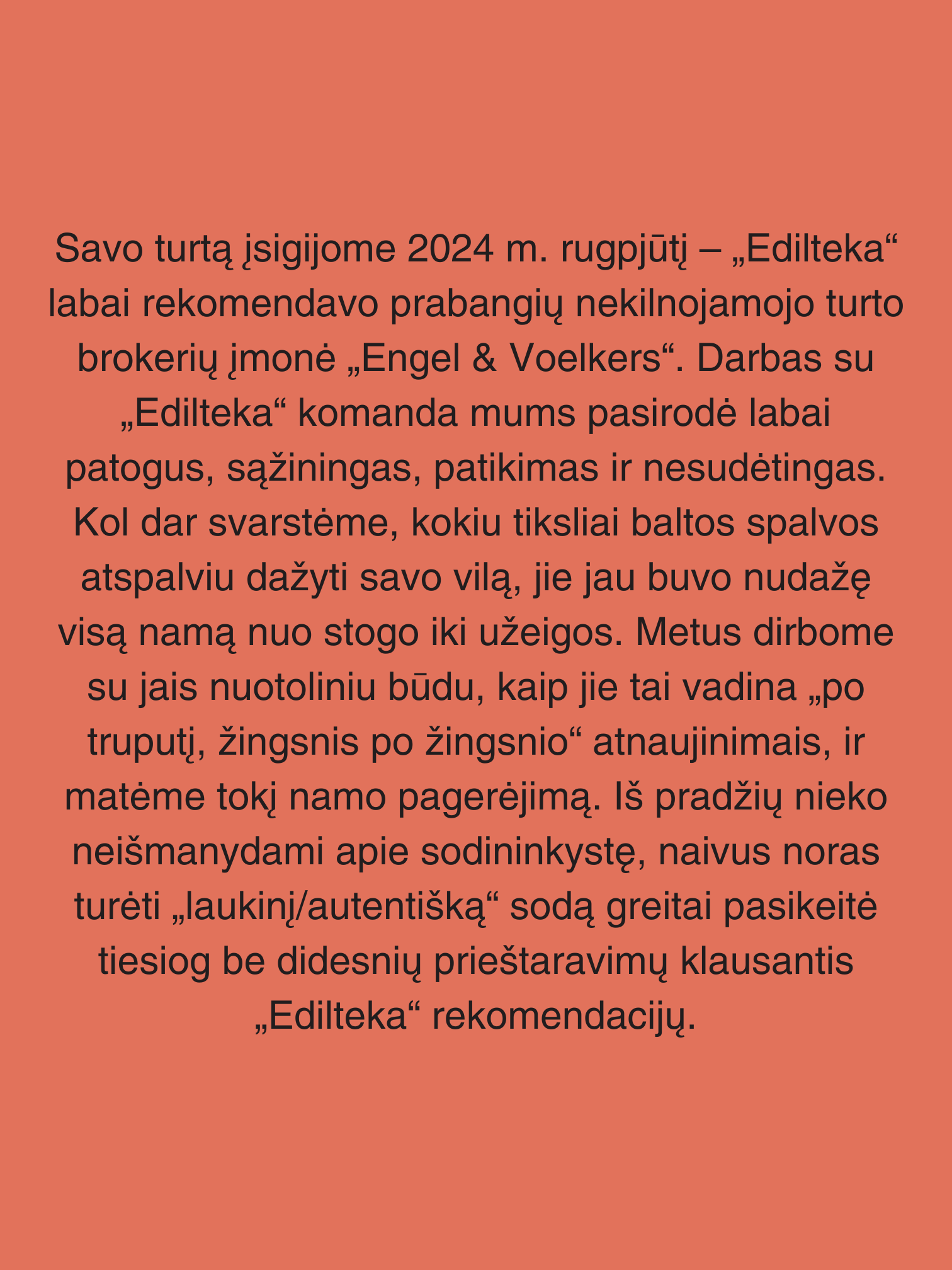 Žemiau išgirsite tiesiogiai iš mūsų klientų – tiek vietinių, tiek tarptautinių – kaip jie dalijasi savo patirtimi dirbant su „Edilteka“ komanda. Kiekvienas projektas atneša unikalių iššūkių ir galimybių, o šie atsiliepimai suteikia vertingos informacijos apie mūsų požiūrį, patirtį ir įrodytą mūsų partnerystės modelio naudą.